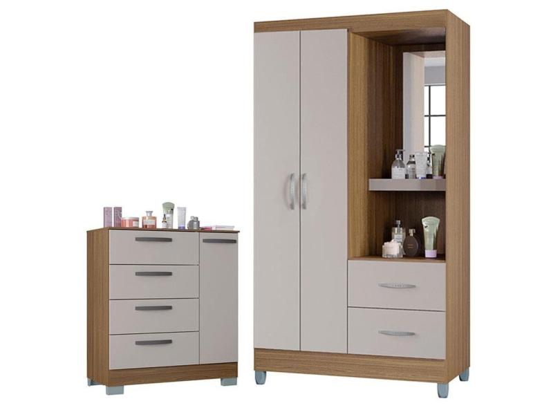 Cômoda 868 4 Gavetas e 1 Porta com Guarda Roupa Solteiro Córdoba 2 Portas Castanho Off White - Poquema