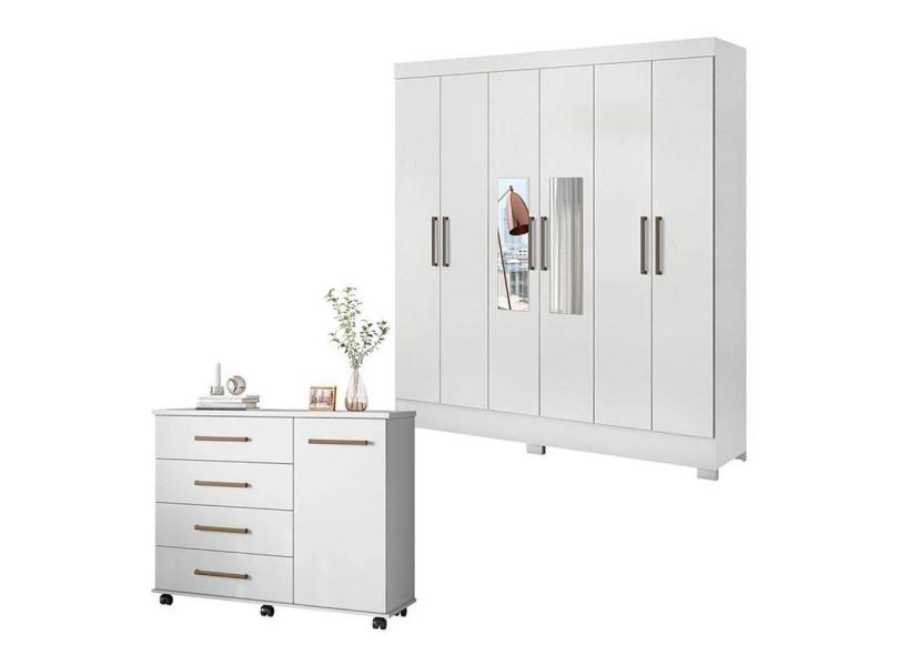 Cômoda Flora e Guarda Roupa Casal Prático Branco com Espelho - Demóbile