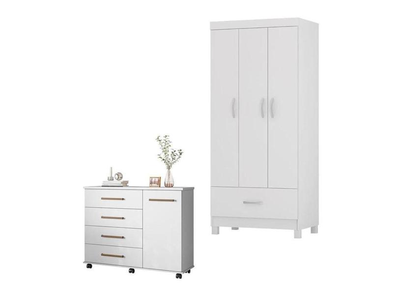 Cômoda Flora e Guarda Roupa Solteiro Prince Branco - Demóbile
