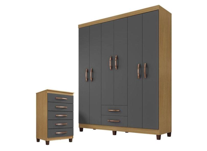 Guarda Roupa Casal Módena e Cômoda Cannes 5 Gavetas Carvalho Americano Grafite - Incorplac