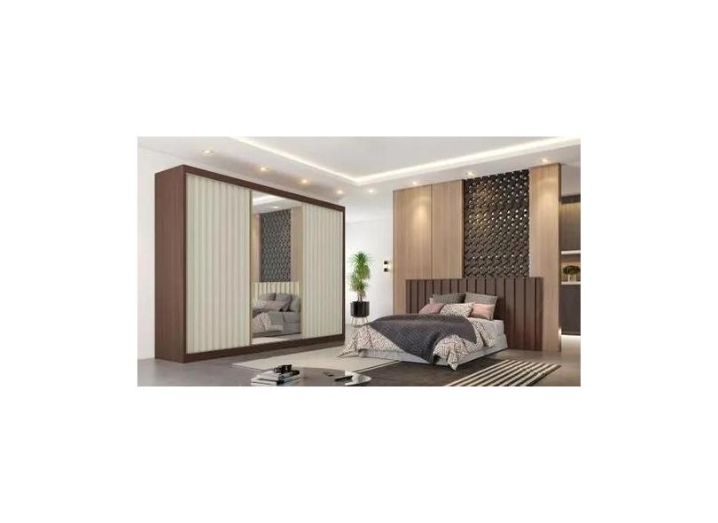 Guarda Roupa Casal Ripado Com Espelho - Athenas-Ipê/Off White - Móveis