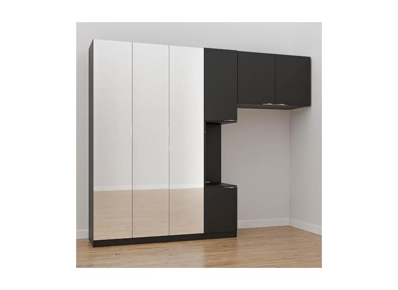 Guarda Roupa Modulado de Solteiro com Espelho e Mesa de Cabeceira Esquerda 7 Portas 3 Peças Hera Cab Preto/cromado