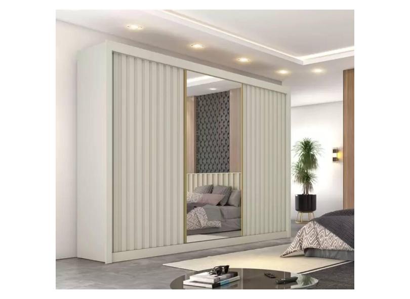 Guarda Roupa Ripado com 3 Portas de Correr e Espelho Central - Athenas-Off White - Móveis Europa