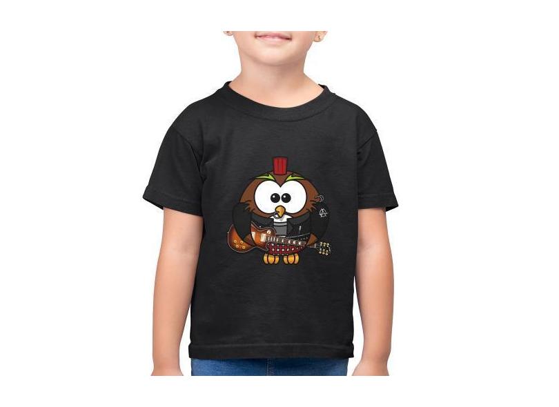 Camiseta Algodão Infantil Coruja Rock Guitarra - Foca na Moda, Preto,