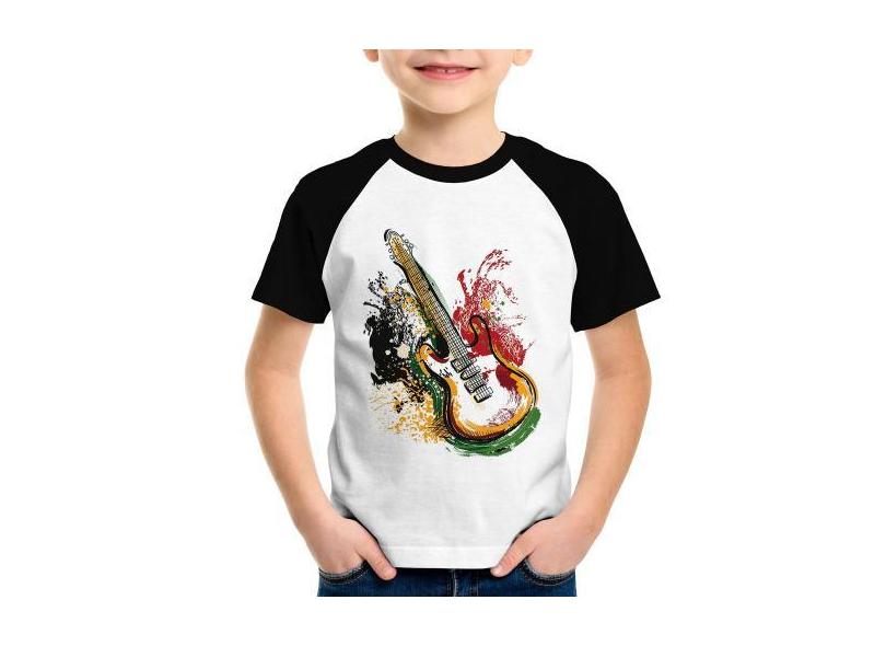 Camiseta Raglan Infantil Guitarra Reggae - Foca na Moda, Branco, Preto