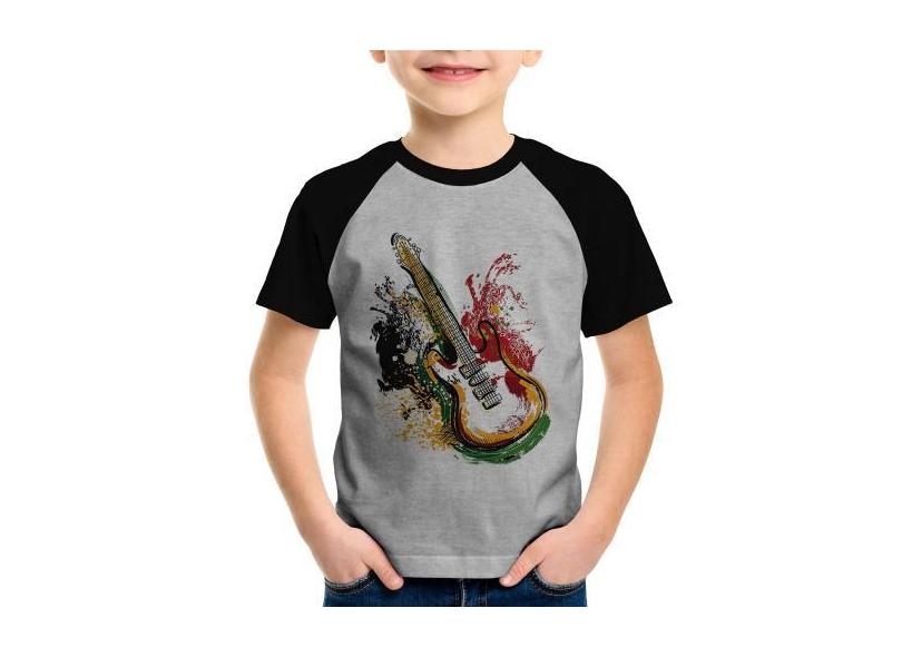 Camiseta Raglan Infantil Guitarra Reggae - Foca na Moda, Cinza, Preto,