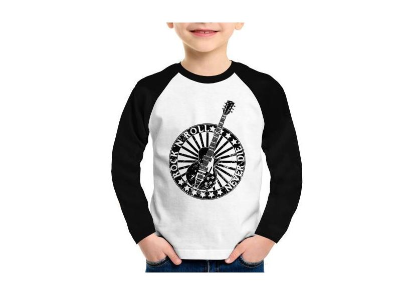 Camiseta Raglan Infantil Rock n Roll Never Die Guitarra Manga Longa -