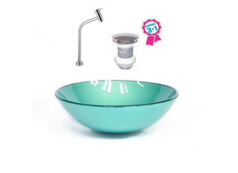 Cuba De Vidro Redonda 31Cm Verde + Válvula Click + Torneira De Metal