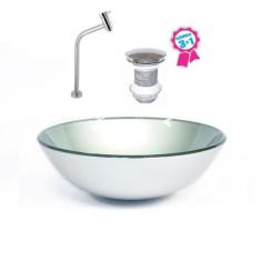 Cuba De Vidro Redonda 35Cm Prata + Válvula Click + Torneira De Metal