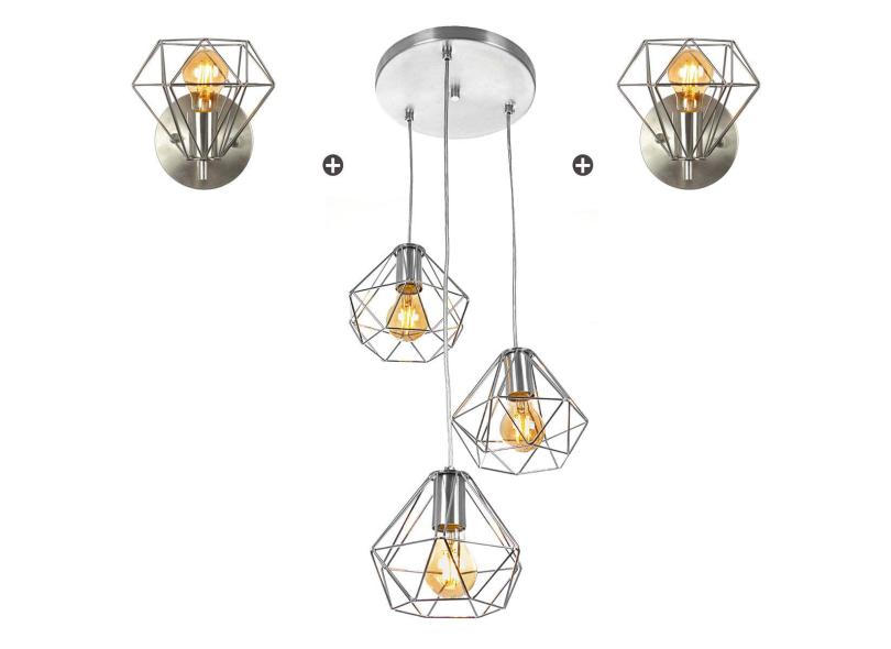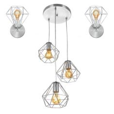 Kit 1 Pendente Triplo + 2 Arandelas Diamante Aramado Cromado