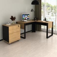 Escrivaninha em L 136x135cm com Gaveteiro 3 Gavetas com Chave Amêndoa/Preto
