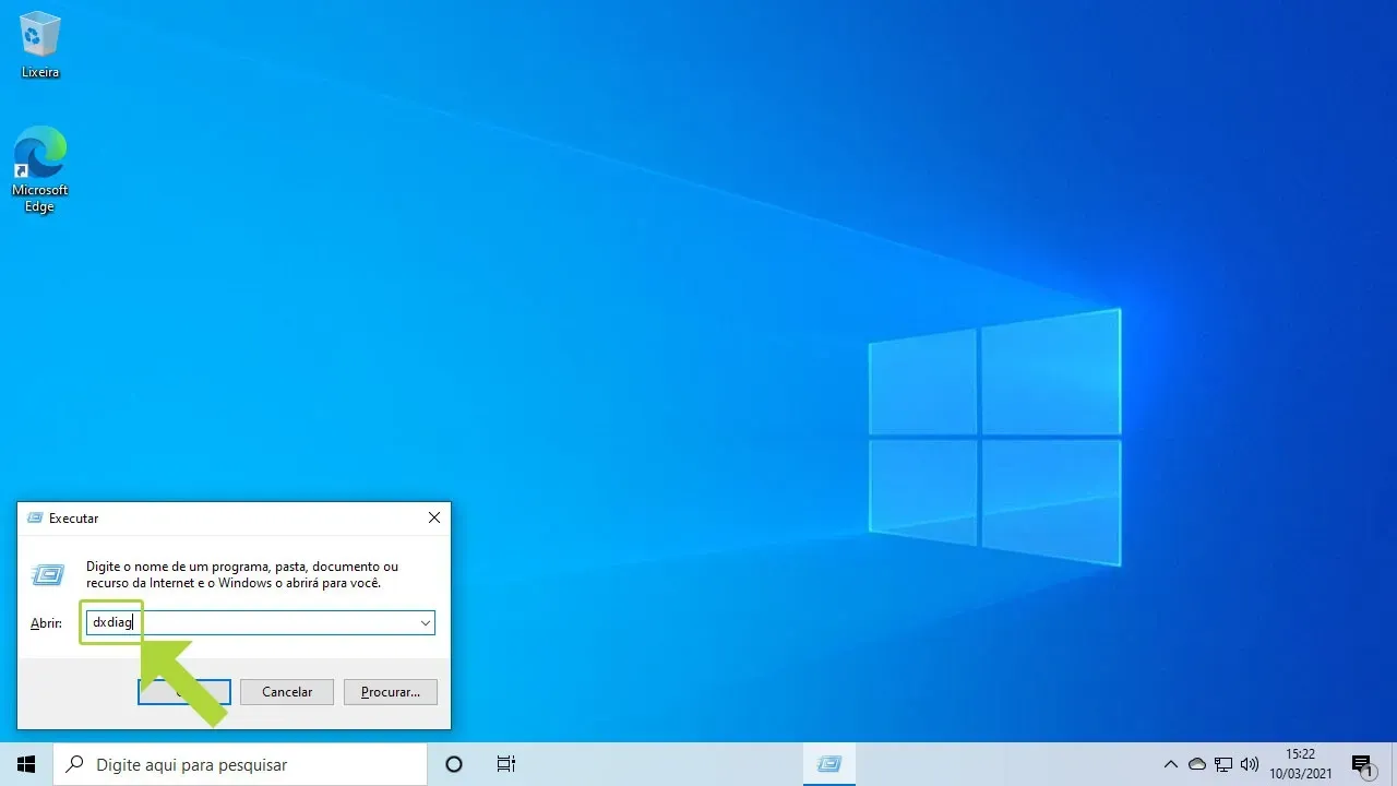 Passo 1: Pressione a tecla Windows + R, digite "dxdiag" e pressione Enter.