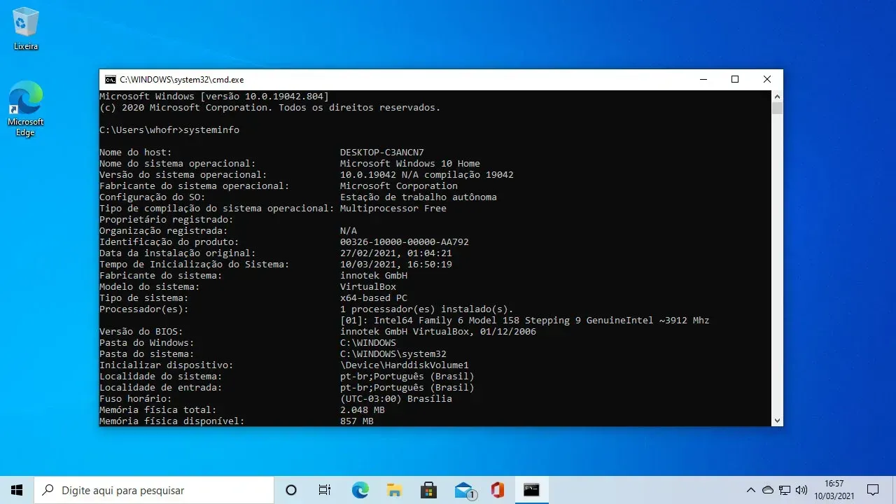 Passo 2: Digite "systeminfo" e pressione Enter. Uma lista detalhada das especificações do sistema será exibida, podendo ser necessário usar a barra de rolagem para visualizar todas as informações.