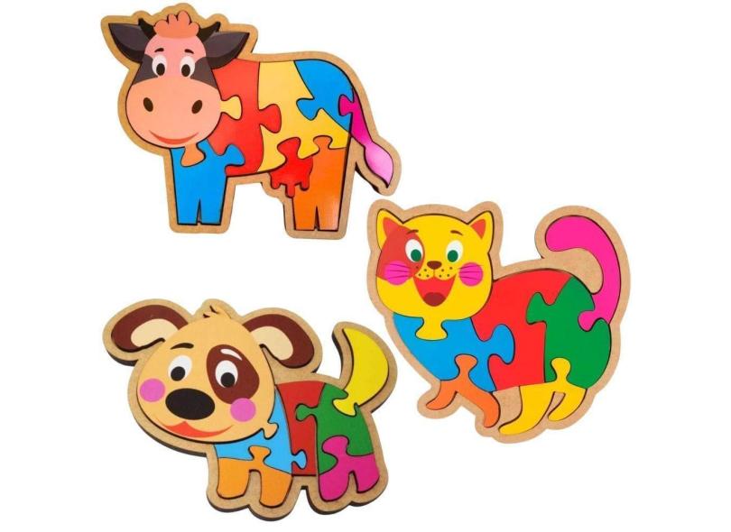 Kit 3 Quebra-Cabeça Jogo Educativo Animais Infantil Madeira