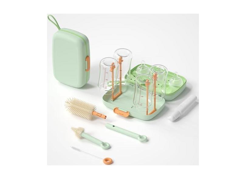 Suvast Kit de limpeza de mamadeiras 7 em 1, essenciais para bebês, com escova de mamadeira, escova de mamilo, escova de limpeza de palha, dispensador de sabonete, prateleira de secagem de mamadeira,