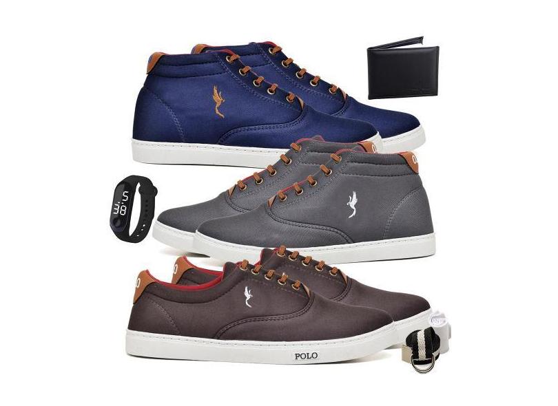 Kit 3 Tênis Casual + Acessórios + Relógio Dia a Dia Macio - Polo Blu,