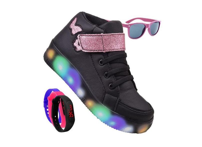 Tenis Botinha Feminino De Led Borboleta Glitter + Oculos Relogio - Kid