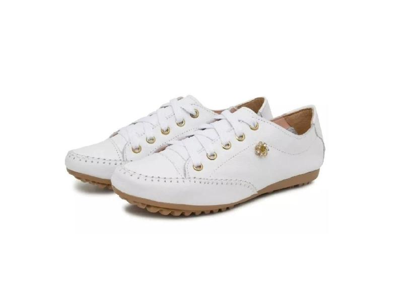 Tênis Casual em Couro Feminino com Cadarço Detalhe em Pedra e Costura Manual-Feminino