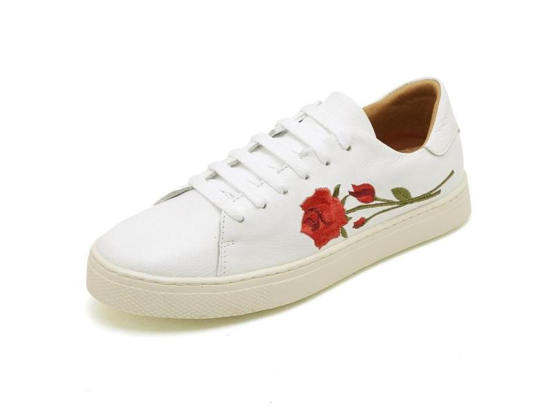 Tenis Casual Feminino Couro Detalhe Flores Forrado Cano Curto Com Cadarço Esportivo Caminhada-Feminino