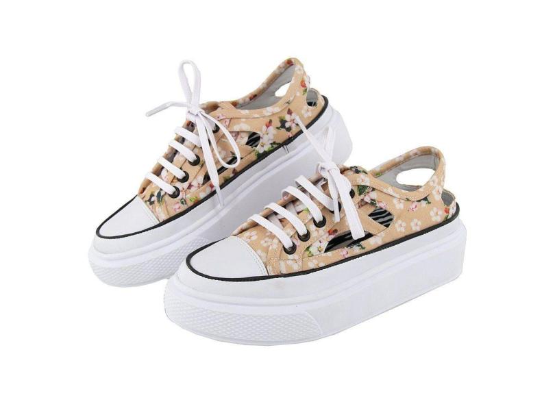 Tenis Casual Feminino Florido Detalhe Vazado Ajuste Cadarço Palmilha Em Gel Macia Confortavel Leve