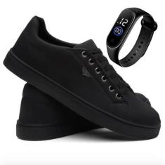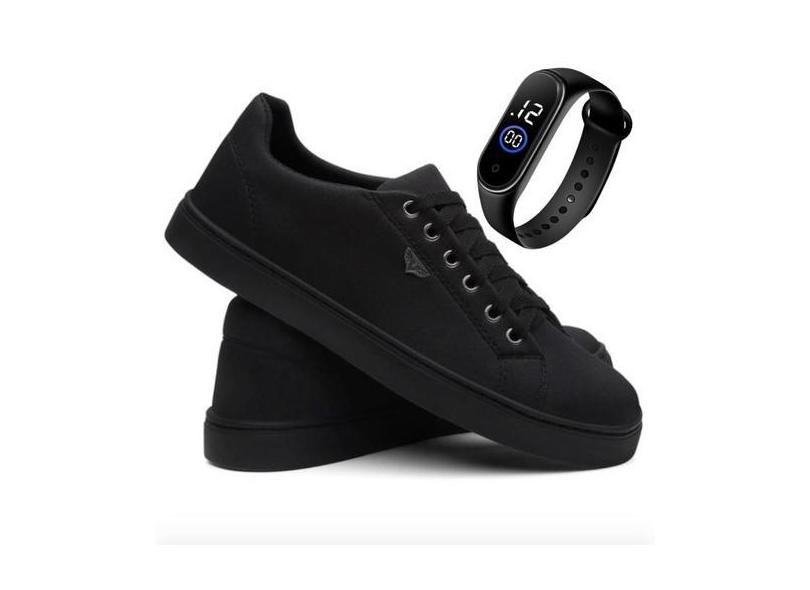 Tênis Sapatênis Masculino Casual Solado Costurado Preto + Relógio Led